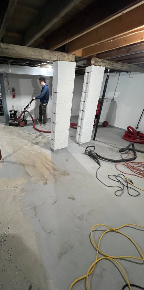 We prep the surface by profiling with diamond grinders and throughly vacuuming. Next we make all necessary repairs to the concrete, such as cracks, pitting, spalling, reforming broken edges with an epoxy mortar.